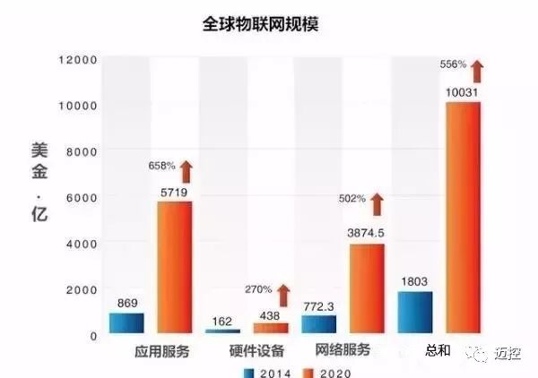 图四是2020年全球物联网规模的预估产值,预计在2020年全球物联网的规模将成长到1兆美金,而应用服务的成长在整体物联网规模的市值中是最明显的,高达6.5倍的成长,从这样的数据也透露,市场对于物联网得应用将会更加多元,且带给用户的附加价值也随之提升。